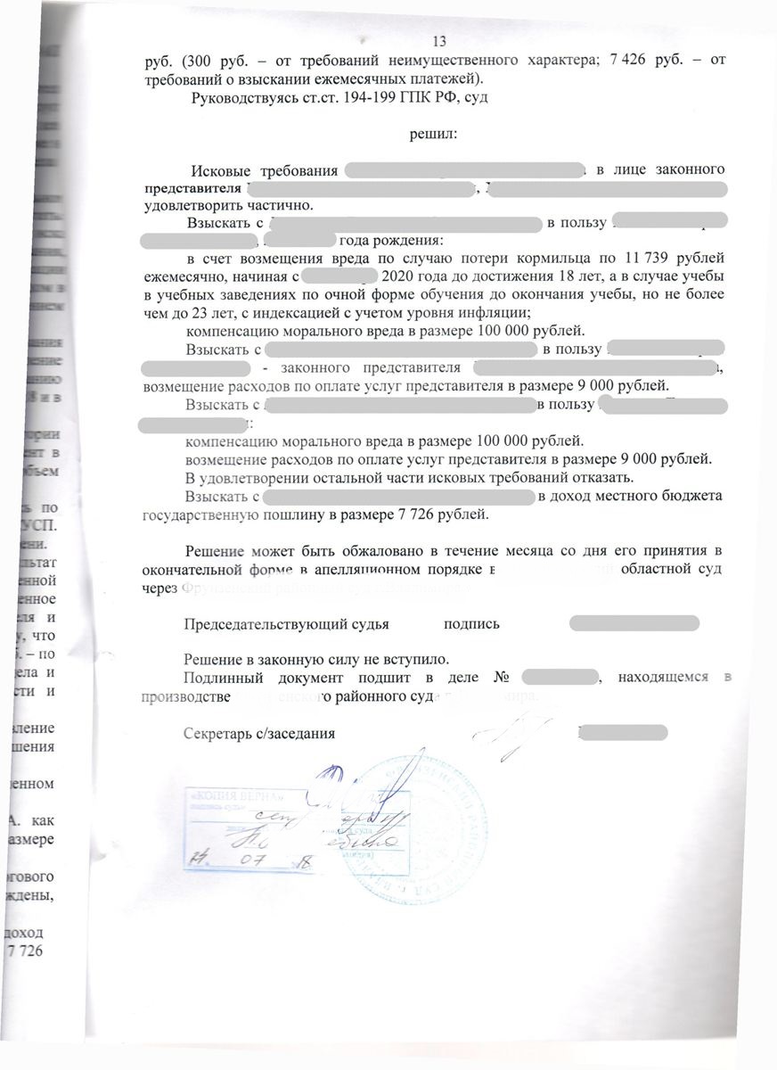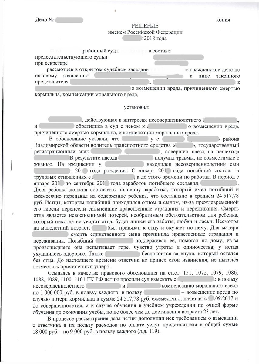 с ответчика составляла 2 000 000 (два миллиона) рублей, а также ежемесячные денежные платежи в связи с утратой кормильца, были определенны в размере 24517,78 (двадцать четыре тысячи пятьсот семнадцать рублей, 78 копеек ) до достижения ребенком оставшимся без кормильца возраста 23 лет.